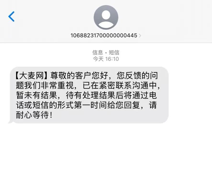 该网友还表示,在演出结束当天就向大麦平台提出了退费申请,13日平台方受理,收到了平台受理的短信,称“您反馈的问题我们非常重视,已在紧密联系沟通中,暂未有结果,待有处理结果后将通过电话或短信的形式第一时间给您回复。”