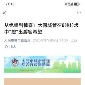 7月6日下午,大同市城市管理局官方微信公众号以《从绝望到惊喜!大同城管在8吨垃圾中“挖”出游客希望》为题,率先讲述了这个他们认为很感人的故事。