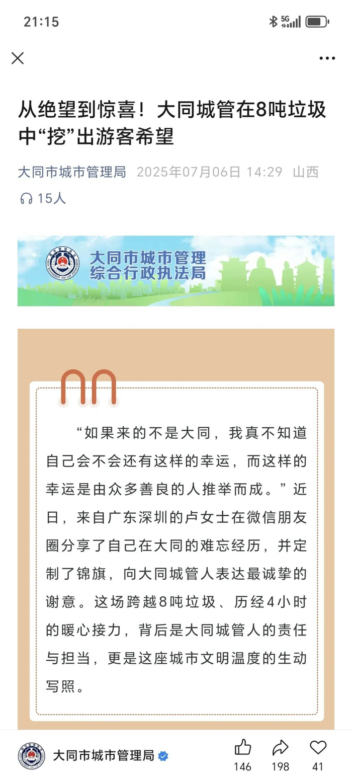 文章开头即“上了价值”:“如果来的不是大同,我真不知道自己会不会还有这样的幸运,而这样的幸运是由众多善良的人推举而成。” 近日,来自广东深圳的卢女士在微信朋友圈分享了自己在大同的难忘经历,并定制了锦旗,向大同城管人表达最诚挚的谢意。这场跨越8吨垃圾、历经4小时的暖心接力,背后是大同城管人的责任与担当,更是这座城市文明温度的生动写照。