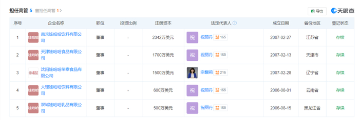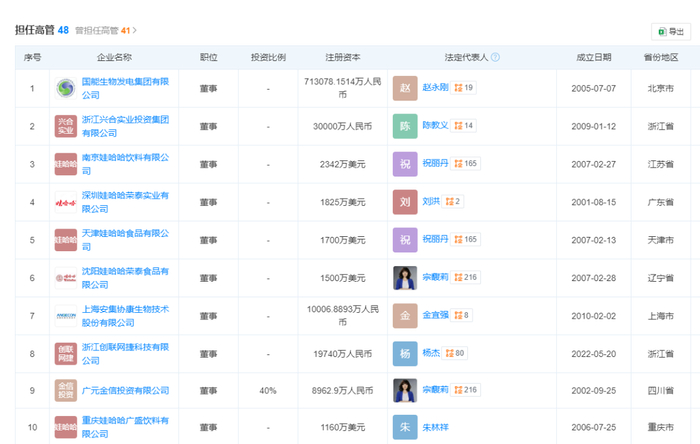 即便放眼现在,杜建英依然在娃哈哈中扮演着举足轻重的角色。目前她担任的48家高管中,很多还是娃哈哈旗下公司。