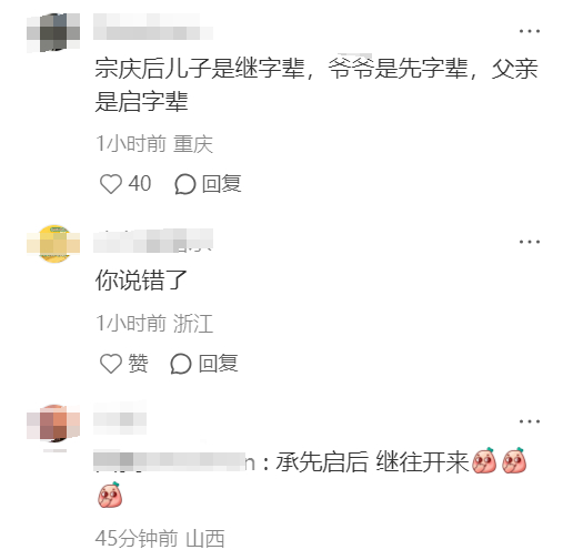 4)据社区平台消息,宗氏家族目前的辈分是“承先启后”,“继往开来”。目前来看父亲宗启騄,自己宗庆后,儿子应该就是继字辈。