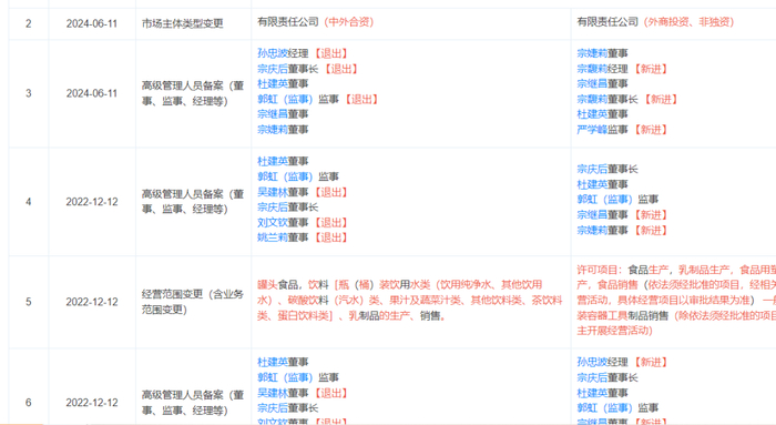 两人成为董事的时间是2022年12月,当时宗庆后尚在世时,而宗馥莉则是宗庆后去世后,6月接手的。