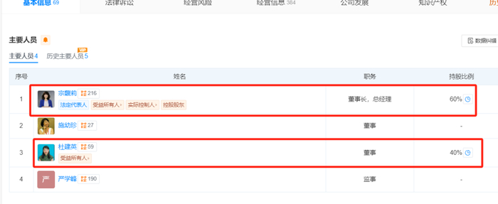 根据天眼查,杜建英担任股东和高管的至少有2家公司,宗馥莉担任法人。1)成立于2022年的广元金信投资公司,宗馥莉持股60%,杜建英持股40%。2022年法人是宗庆后,24年宗庆后去世后宗馥莉接手这60%。