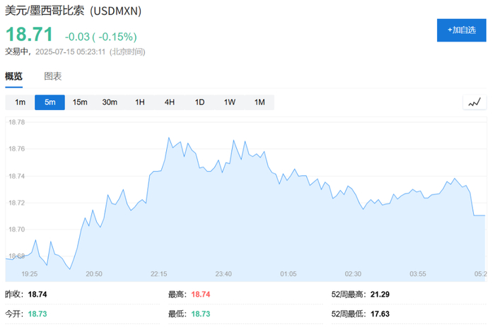 墨西哥综合指数收跌0.41%,美元兑墨西哥比索维持0.15%跌幅,报18.71比索。
