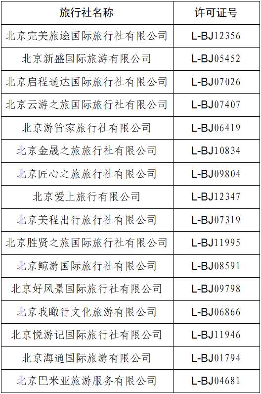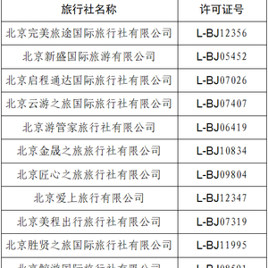 根据我市旅行社涉诉情况统计,现公示2025年6月30日—7月6日,北京市投诉量排名前十五旅行社名单如下(含投诉量相同旅行社共16家):