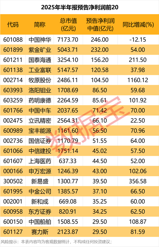 从净利润规模来看,中国神华、紫金矿业、国泰海通、工业富联、牧原股份净利润规模逾百亿元,依次为246亿元、232亿元、156.2亿元、120.58亿元、104.5亿元;洛阳钼业、药明康德、中国中车、立讯精密、宝丰能源和国信证券6股净利润规模也在50亿元以上。