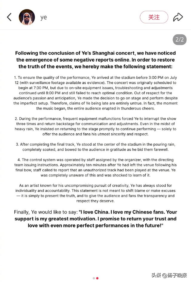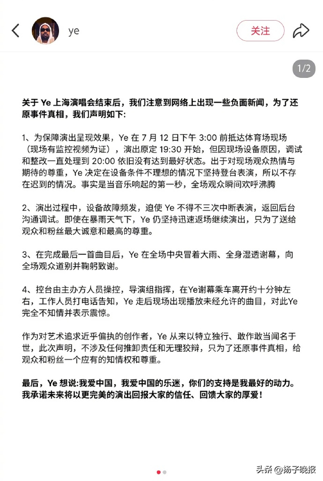最后,Ye想说:我爱中国,我爱中国的乐迷,你们的支持是我最好的动力。我承诺未来将以更完美的演出回报大家的信任、回馈大家的厚爱!