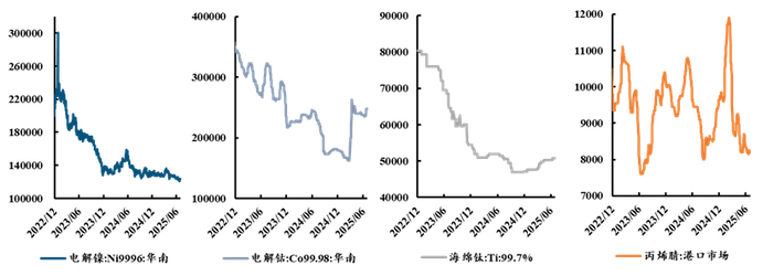 钛合金方面,6月海绵钛价格(5.08万元/吨,环比上升0.99%)继续上涨,航空航天及军工领域需求保持强劲,推动0级、1级高端海绵钛价格维持高位,部分龙头企业年内多次提价。但民用领域持续疲软,化工装备和体育用品等下游订单萎缩。