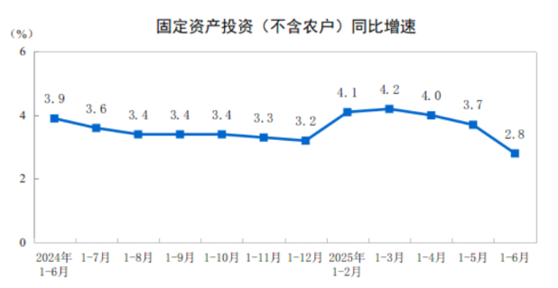 格隆汇7月15日|国家统计局数据显示,2025年上半年,全国固定资产投资(不含农户)248654亿元,同比增长2.8%(预期3.7%,前值3.7%)。其中,民间固定资产投资同比下降0.6%。扣除价格因素影响,固定资产投资(不含农户)同比增长5.3%。从环比看,6月份固定资产投资(不含农户)下降0.12%。