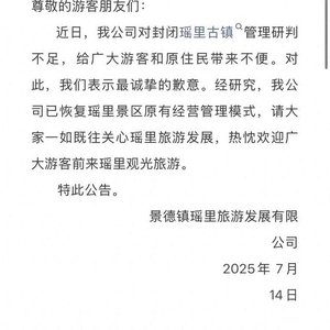 近日,我公司对封闭瑶里古镇管理研判不足,给广大游客和原住民带来不便。对此,我们表示最诚挚的歉意。经研究,我公司已恢复瑶里景区原有经营管理模式,请大家一如既往关心瑶里旅游发展,热忱欢迎广大游客前来瑶里观光旅游。