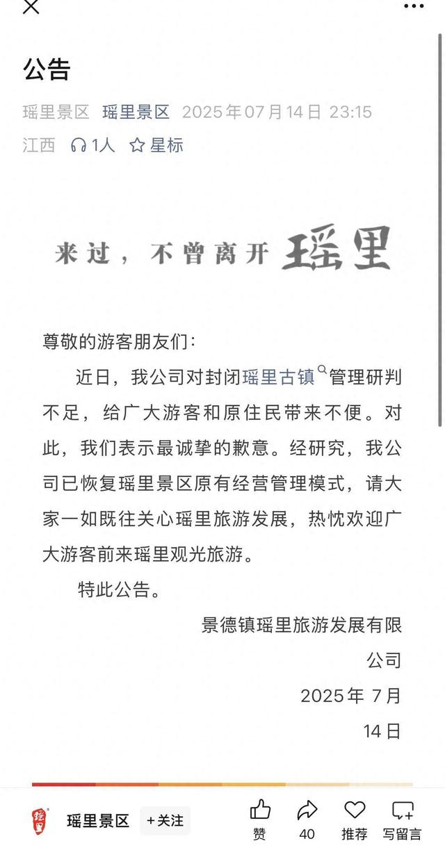 近日,江西景德镇浮梁县瑶里古镇景区因门票事宜,运营方与当地村民产生分歧。不少村民通过社交平台发声,提醒游客无需购买门票,还在景区入口通道张贴告示,指引游客从其他通道免费进入村落游玩。 7月14日晚间,“遥里景区”公众号发布公告称:已恢复原有经营管理模式。以下是公告全文: