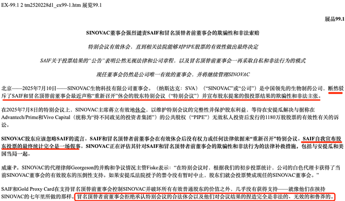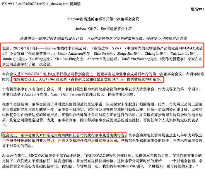 科兴生物(SVA)近日的特别股东大会演变成一场控制权争夺的戏剧性对决。股东投票通过赛富基金提出的两项提案:罢免现任董事会,并选举由尹卫东阵营主导的十人新董事会。