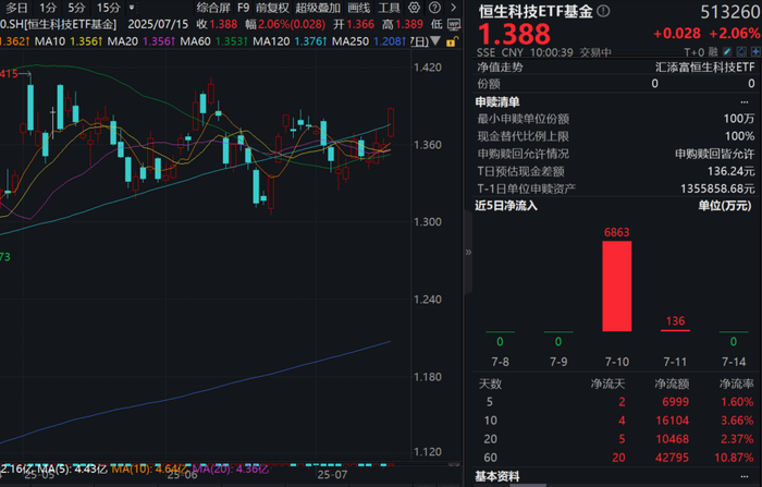 今日(7.15)港股集体大涨,高纯度的港股通科技30ETF(520980)大涨超2%冲击四连阳,昨日全天大举“吸金”4.75亿元,全天成交额超10亿元,换手率超100%!同类唯一15BP最低档管理费的恒生科技ETF基金(513260)亦大涨超2%,近60日净流入超4.2亿元!