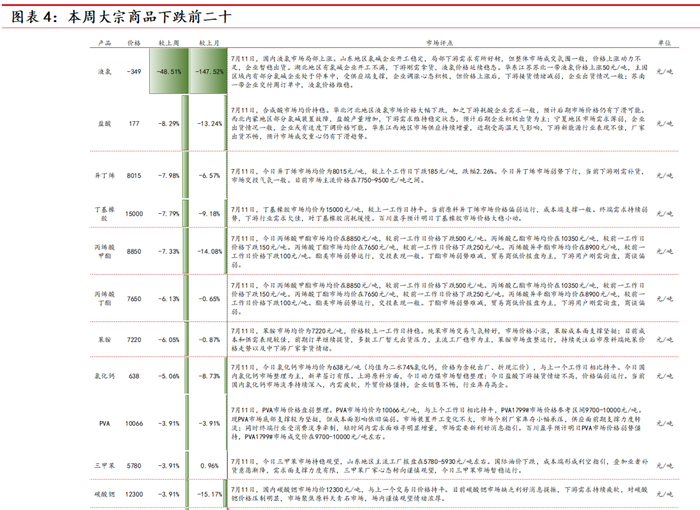 本周大宗商品下跌前二十:液氯(-48.51%)、盐酸(-8.29%)、异丁烯(-7.98%)、丁基橡胶(-7.79%)、丙烯酸甲酯(-7.33%)、丙烯酸丁酯(-6.13%)、苯胺(-6.05%)、氯化钙(-5.06%)、PVA(-3.91%)、三甲苯(-3.91%)、碳酸锶(-3.91%)、乙烯(-3.85%)、丙烯酸异辛酯(-3.78%)、混合芳烃(-3.77%)、草酸(-3.67%)、涤纶DTY(-3.66%)、涤纶POY(-3.62%)、小苏打(-3.52%)、苯甲酸(-3.48%)、正丁醇(-3.45%)。