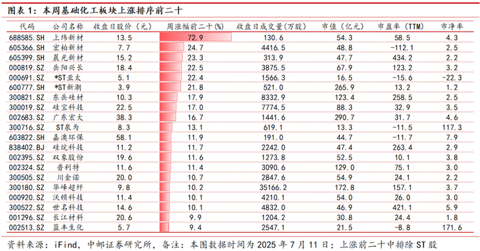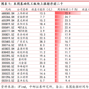 本周基础化工板块上涨排序前二十:上纬新材(72.88%)、宏柏新材(24.72%)、晨光新材(23.30%)、岳阳兴长(22.55%)、*ST亚太(22.36%)、*ST新潮(21.81%)、东岳硅材(17.89%)、硅宝科技(16.97%)、广东宏大(16.69%)、ST泉为(13.06%)、嘉澳环保(11.86%)、硅烷科技(11.74%)、双象股份(11.58%)、普利特(11.43%)、川金诺(10.69%)、华峰超纤(10.16%)、沃顿科技(10.12%)、世名科技(10.05%)、长江材料(9.86%)、蓝丰生化(9.35%)。