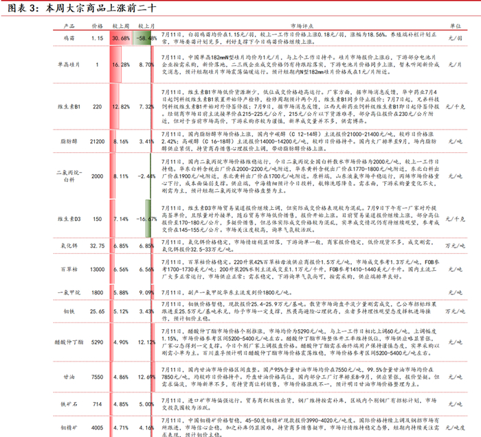 本周大宗商品上涨前二十:鸡苗(30.68%)、单晶硅片(16.28%)、维生素B1(12.82%)、脂肪醇(8.16%)、二氯丙烷-白料(8.11%)、维生素D3(7.14%)、氧化铒(6.85%)、百草枯(6.56%)、一氯甲烷(5.88%)、钼铁(5.12%)、醋酸仲丁酯(4.90%)、甘油(4.86%)、铁矿石(4.85%)、钼精矿(4.71%)、氧化钼(4.58%)、TDI(4.47%)、工业萘(3.90%)、丁酮(3.79%)、三氯甲烷(3.75%)、丁二烯(3.71%)。