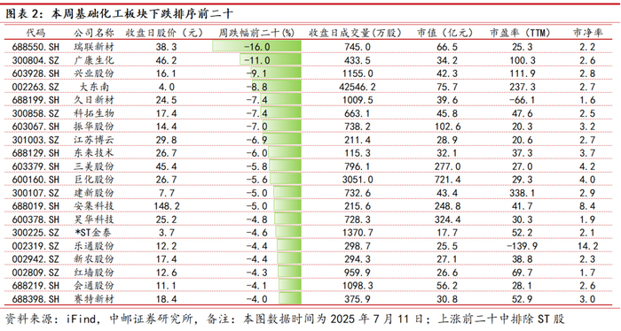 本周基础化工板块下跌排序前二十:瑞联新材(-15.98%)、广康生化(-11.04%)、兴业股份(-9.08%)、大东南(-8.82%)、久日新材(-7.36%)、科拓生物(-7.36%)、振华股份(-6.96%)、江苏博云(-6.94%)、东来技术(-5.96%)、三美股份(-5.77%)、巨化股份(-5.62%)、建新股份(-5.04%)、安集科技(-4.96%)、昊华科技(-4.84%)、*ST金泰(-4.62%)、乐通股份(-4.39%)、新农股份(-4.35%)、红墙股份(-4.26%)、会通股份(-4.07%)、赛特新材(-4.02%)。