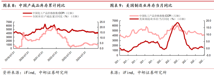 库存端,中美均处于累库阶段。2023年3月中国化工品库存增速达到近年高点,为10.7%。此后,行业主动去库存,累库速度放缓,2024年1-12月,中国产成品累计同比增速为3.3%。2025年1-6月,中国产成品累计同比增速为3.9%。2022年5月美国制造业库存增速达到近年高点,为11.30%。此后,美国进入主动去库存阶段,2023年10月-2024年2月美国制造业库存连续五个月出现负增长,2024年11月至2025年4月,美国制造业库存持续转正。