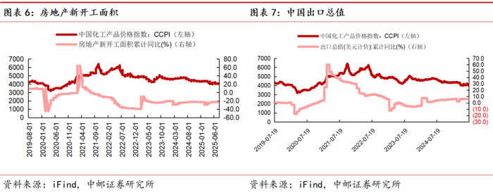 需求端,出口平稳,房产需求待增。中国房地产需求增速处于历史较低水平,2024年1月-12月,中国房地产累计新开工面积增速为-23%,2025年1-6月20日,中国房地产累计新开工面积增速为-22.80%;出口增速比较平稳,2024年1-12月,中国出口总值累计增速为+5.84%。2025年1-6月20日,中国出口总值累计增速为6%。我们预计伴随着国内房地产政策陆续出台、美国制造业PMI回升,中国内外需有望迎来改善。