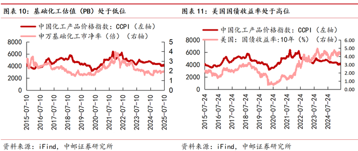 估值端,估值有望迎来提升。截止2025年7月11日,基础化工估值(PB)为1.94倍,处于2014年以来17.69%低分位,十年期美国国债收益率4.43%,处于2014年以来87.67%高分位,估值有望迎来提升。