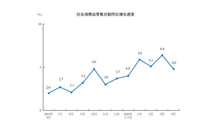 国家统计局:2025年6月份社会消费品零售总额增长4.8%