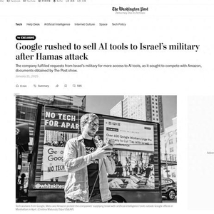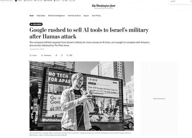 今年1月21日,《华盛顿邮报》发表题为《在哈马斯发动袭击后,谷歌迅速向以色列军方出售人工智能工具》的文章。文章配图为谷歌、亚马逊等美国科技企业员工在纽约抗议这些公司向以色列提供人工智能工具。