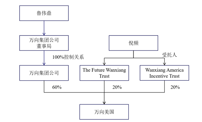 而万向美国为万向钱潮控股股东万向集团持股60%的企业,后者的实际控制人为鲁伟鼎;持有另外40%股权的倪频也不是外人,而是鲁冠球的小女婿、万向钱潮董事长和万向美国总裁。