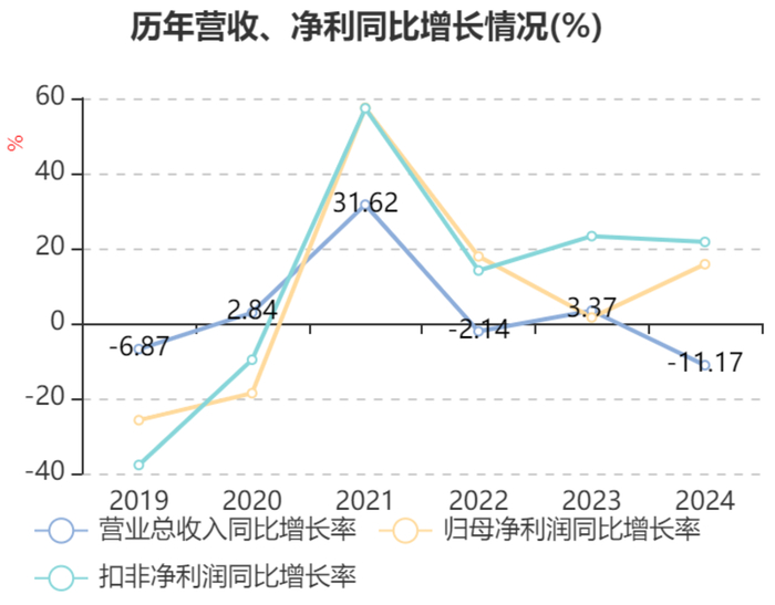 而在汽车行业“内卷”和“价格战”加剧背景下,万向钱潮近年来的业绩表现也在承压。Choice数据显示,公司自2021年营业收入和增长率达到顶峰后增速滑坡明显,营业收入在2022年2024年两度出现负增长,2024年营业总收入同比减少16.18亿元,同比下降11.17%。
