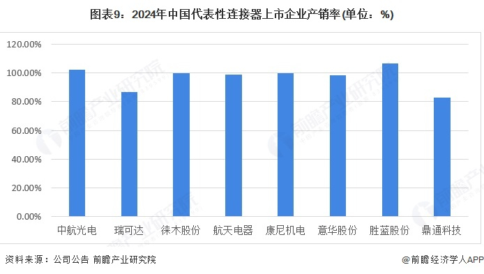 2024年,从上市企业连接器相关业务产销来看,行业整体产销率在100%左右,瑞可达和鼎通科技产销率低于90%,行业整体供需较为平衡。
