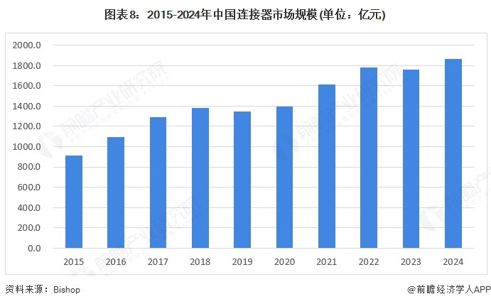 伴随着中国经济的持续增长,国内通信、消费电子、汽车、工控安防等连接器下游产业迅速发展,使得中国连接器市场规模持续扩大,保持平稳增长的趋势,成为推动全球连接器市场增长的重要动力。2024年,中国连接器市场规模达到了1866亿元,自2015年以来,中国连接器市场规模的复合增长率高达7%,显示出中国连接器行业的强劲增长势头。