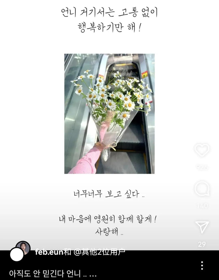 家属透露:“她顺利完成第一次抗癌治疗,但在第二次治疗期间身体状况突然恶化。”并表示,“虽然做了心理准备,但至今仍难以接受。”