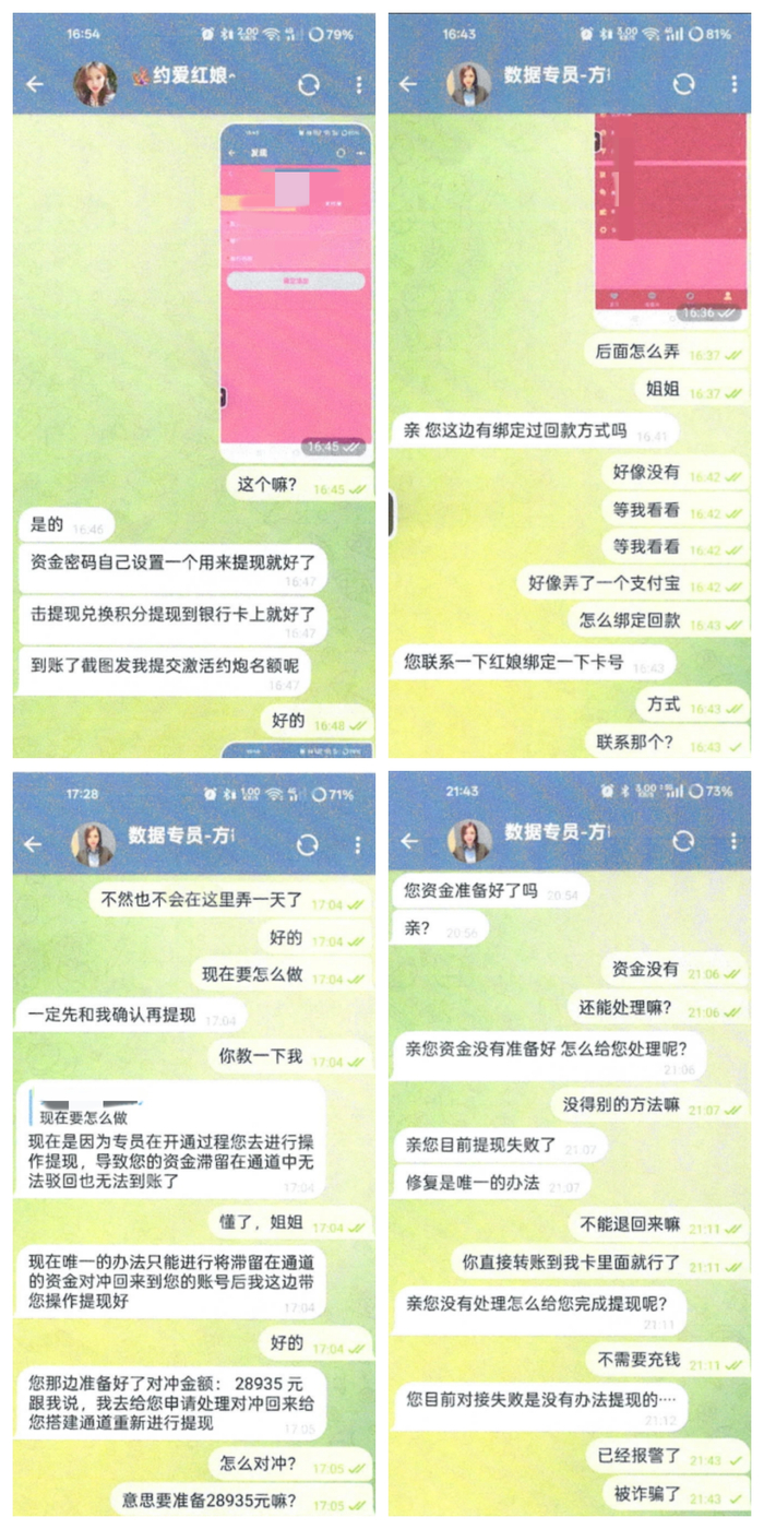 5月27日,张某(化名)在宿舍收到“快手”消息,有陌生人向其发送一个二维码,张某扫码后出现约炮软件,下载注册后充值39元会员费,随后客服让其按指引操作,在网页内充值378元后下注竞猜大小,每笔189元,未中奖后对方称可以退费。张某多次充值转账后,客服以其银行卡出现问题为由让其继续充值保证金解冻才能解冻资金。张某发现被骗后报警,共计被诈骗22451.9元。