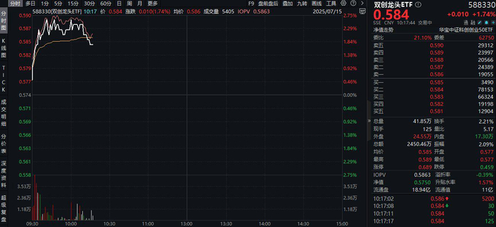 今日(7月15日)创业板指领涨主要宽基指数,成长风格表现强势,覆盖创业板+科创板高成长龙头的双创龙头ETF(588330)场内价格盘中涨超2.6%,现涨1.74%,实时成交额超2400万元,交投较为活跃!
