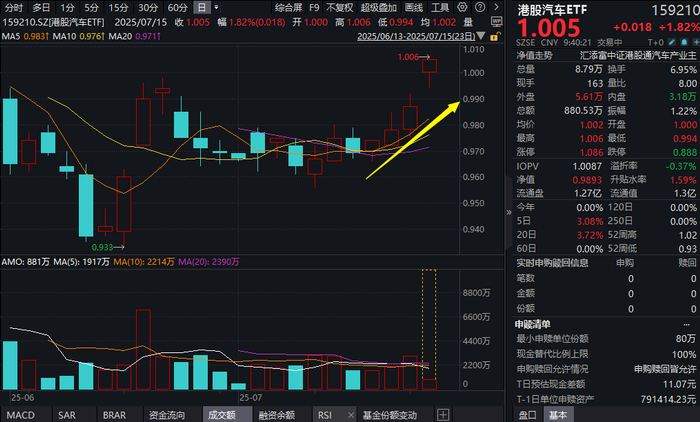 7月15日,港股汽车板块跳空高开,截至10:03,港股汽车ETF(159210)放量涨1.82%,冲击四连涨!
