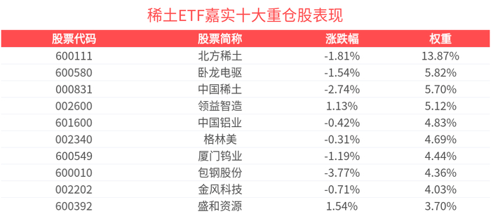 数据显示,截至2025年6月30日,中证稀土产业指数前十大权重股分别为北方稀土、中国稀土、中国铝业、格林美、领益智造、包钢股份、卧龙电驱、金风科技、厦门钨业、盛和资源,前十大权重股合计占比55.58%。
