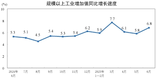 2025年6月份规模以上工业增加值增长6.8%
