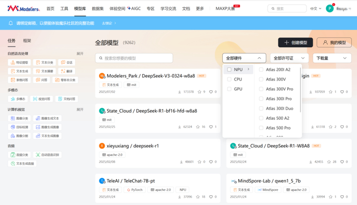 社区已汇聚1000+ 优质大模型、涵盖 TeleChat、DeepSeek、Qwen、智谱等大模型,其中多数都已经适配好国产算力。