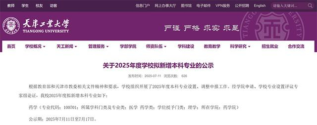 根据教育部和天津市教委相关文件精神和要求,学校组织开展了2025年度本科专业设置、调整申报工作。经学院申请、学校专业设置评议专家组论证,学校2025年度拟新增本科专业如下: