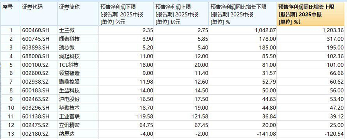从归母净利润增幅来看,士兰微、闻泰科技、瑞芯微、澜起科技、TCL科技上半年净利润同比预增上限均超100%,其中士兰微净利润增幅预计最高增超1203%!