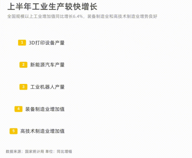 上半年,全国规模以上工业增加值同比增长6.4%;装备制造业增加值同比增长10.2%,高技术制造业增加值增长9.5%,增速分别快于全部规模以上工业3.8和3.1个百分点。