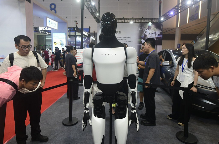 2025年6月22日,浙江杭州,观众在机器人展上观看特斯拉的人形机器人“擎天柱(Optimus)”。