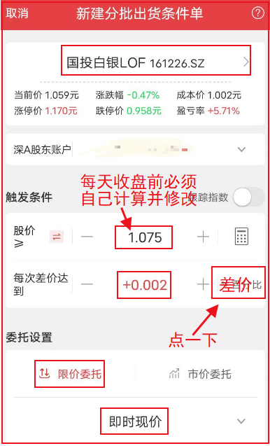 把“百分比”改成“差价”,填0.002元,分3-5笔卖出。