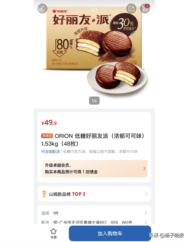 社交媒体上被质疑的“低糖好丽友派”,于今年6月在山姆上新。新品在原有配方上进行了创新,减少了80%的糖分,同时增加了30%的可可含量,售价为49.9元一盒,内含48枚。