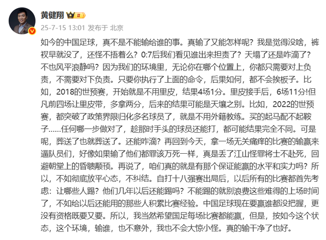 7月15日,知名足球评论员黄健翔在社媒发长文评论国足表现。