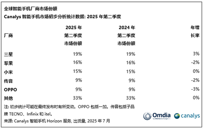 今天,市场研究机构Canalys发布了2025年第二季度全球智能手机出货量前五大厂商的排名。据统计,第二季度全球智能手机市场出现了1%的同比下滑,这也是该行业连续六个季度以来的首次下跌。尽管出货量略有下降,Canalys指出,这一变化反映出在全球宏观经济环境的不确定性和消费者情绪较为谨慎的背景下,各大厂商的整体表现依然保持稳定。