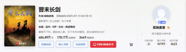 孤独麦客代表作有《晋末长剑》《晚唐浮生》等,孤独麦克在接受采访时分享了晋升“大神作家”的感言:“有些意外,更有些感动。老实说,这是起点对我的肯定,同时也是读者对我的肯定。”孤独麦克的代表作《晋末长剑》讲述西晋末年,出身军户的邵勋在乱世中从底层崛起的故事,以精彩的谋略篇章获得读者的喜爱,“对我而言,创作这本书等于学习了一遍两晋时期的历史。”创作这本小说最大的挑战在于魏晋的史料太少,“资料不足就是最大的挑战,因为当我想拼图这个社会的时候,总觉得素材不够,需要自己合理推导来填补。”尽管史料不足,但孤独麦克认为历史小说的创作不同于其他类别,不能随心所欲自由创造,“它首先需要你去了解当时的社会风貌,揣摩各种历史事件背后的深层次原因。也就是说,需要你自己能对历史做出解读,哪怕是一家之言,也要有你自己的想法。然后在此基础上,通过对社会、经济、文化、军事、政治、艺术、风气等各个方面的描写,尽可能模拟一个相对真实的社会,让读者有沉浸感。”