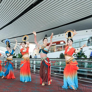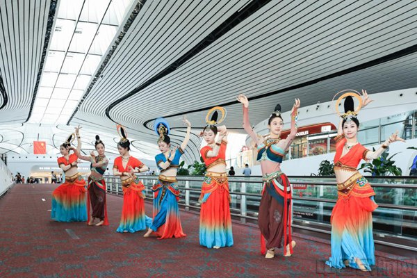 快闪舞蹈表演分别在国际出发候机区、中国园、国内混流区音乐花园、瓷园四处场地开展。舞者们用《彩塑生花》《双生》两部舞蹈作品为旅客们生动再现莫高窟壁画中的乐舞形象,将敦煌壁画中的千年艺术带到大兴机场,吸引约2.5万名旅客驻足观赏。