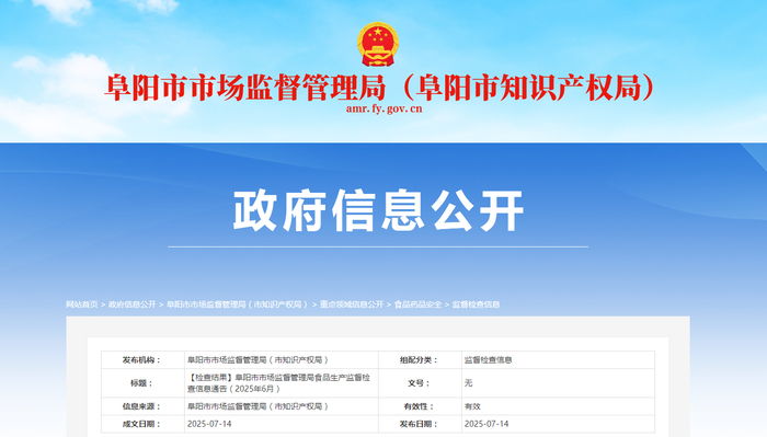 安徽省阜阳市市场监督管理局食品生产监督检查信息通告(2025年6月)