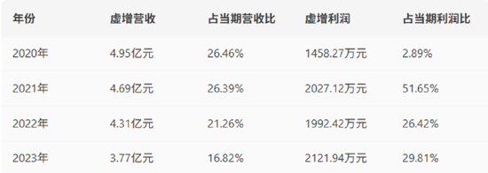 2020至2023年,公司通过三家子公司与关联方虚构无商业实质的贸易交易,累计虚增营收17.7亿元。分年度数据如下表所示: