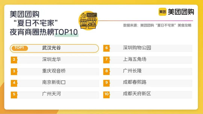 夏日不宅家,避暑不避欢。今年暑期,“昼伏夜出”正在成为餐饮消费新宠,各地夜宵市场愈加火热。近日,美团团购发布“夏日不宅家”美食攻略。美团团购数据显示,夏至以来,武汉光谷、深圳龙华、重庆观音桥、南京新街口、广州天河、深圳购物公园、上海五角场、广州长隆、成都春熙路、成都天府新区的夜间逛吃客流持续领跑,成为全国十大热门夜宵商圈。